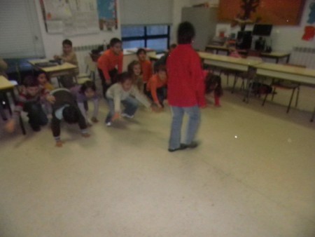 Também fazemos jogos de expressão física- motora. Quando não podemos ir para o recreio, fazemos a aula dentro da sala de aula. Os jogos até são divertidos e gostamos muito!